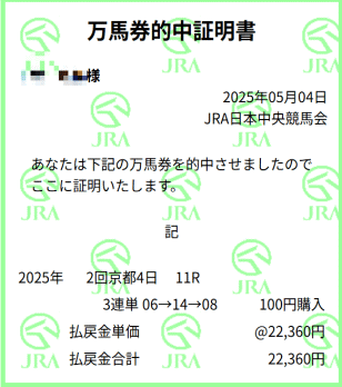 皐月賞的中!相方が。。二馬予想では3連複でしたが3連単買ったそうです