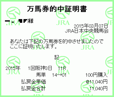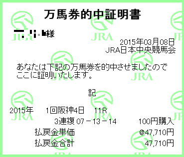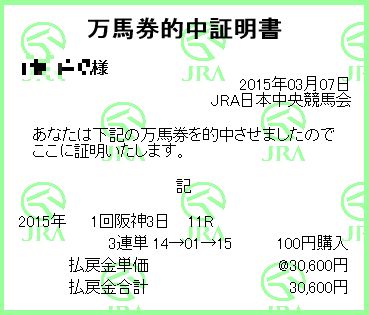 Posted 土曜日, 3月 7th, 2015 at 12:06 AM Filed Under Category: ┠ 万馬券 You can leave a response, or trackback from your own site.