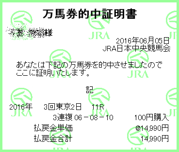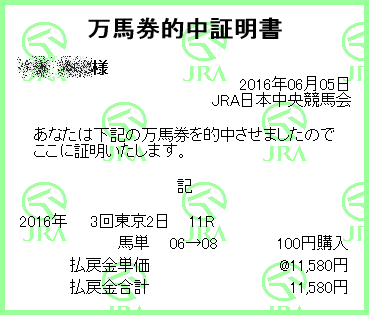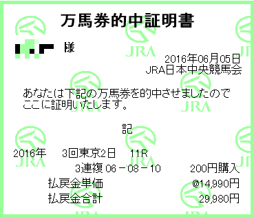 家内が3連複100円と馬単100円、私は3連複200円を的中!いやぁ田辺騎手ロゴタイプ、よかったですね。次走また買っちゃいそうですが、来ないだろうな。。 |