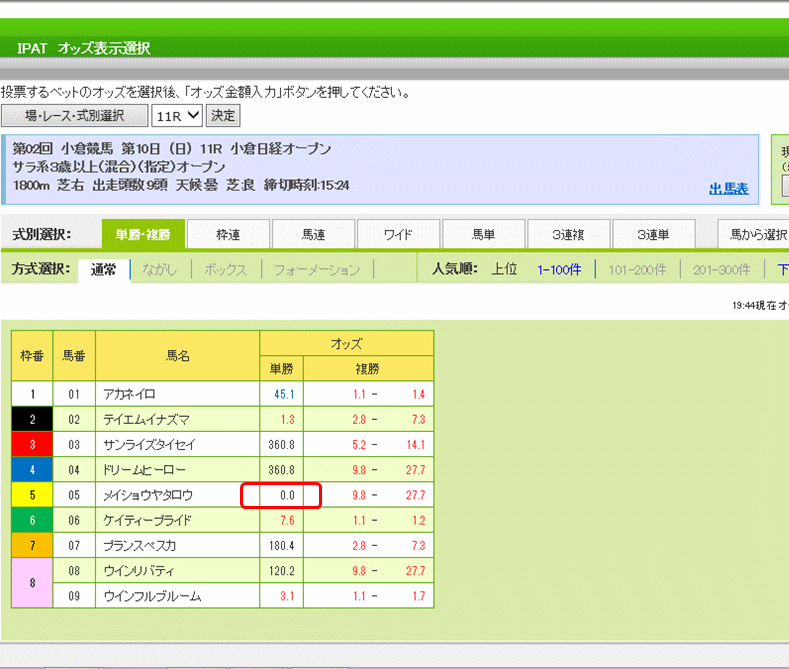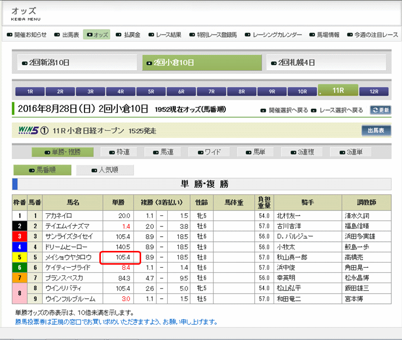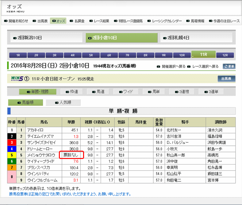 8/28の小倉11レース、「票数なし」というまだ誰も投票していない馬がいたのでこの単勝馬券を買ってみた。きっと何百何千倍のオッズになるぞ♪ と思ったら…アレ、こんなもん?(画像クリックで拡大&矢印キーで5枚スライド)