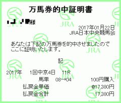 Posted 日曜日, 1月 22nd, 2017 at 10:03 PM Filed Under Category: ┠ 万馬券 You can leave a response, or trackback from your own site.