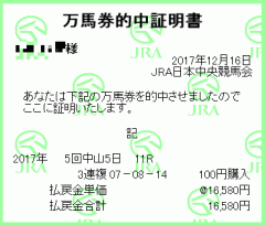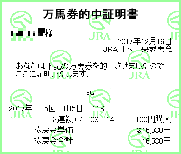 朝日杯前日のターコイズステークス的中!家内が。朝日杯不参加の横典騎手にとってはこれがオレの朝日杯だ、ってとこでしょうか。