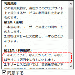 ネットで何かのサービスに新規登録する時によく利用規約が出てきますが、小さい字でダラダラと書いてあるので条文の途中に「あなたは1万円払うこと」とか適当な記載があっても「同意する」にチェックを入れてしまいそうです、週刊二馬です。
