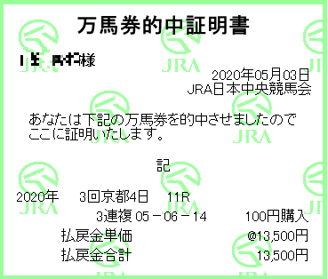 ユニコーンステークス制覇…私が!今年初の万馬券でしたが、「同一週の重賞の出目は来る」というあまり当たっても嬉しくない作戦でした。直前の函館スプリントステークスの出目が6-10-16だったので、6,10,16のうち2個は絡むと読んで6-10/6-16/10-16からの3連複が的中したわけなのでした。