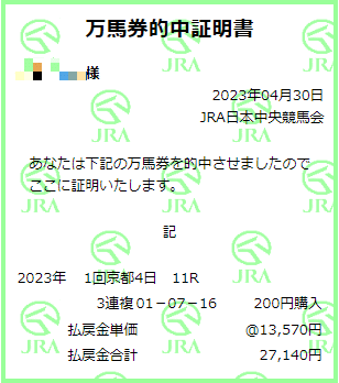 天皇賞・春的中!二馬の予想はタイトルホルダーからだったので外れましたが、来ない時の馬券をあれこれと買っといたらなんとかクリア! 1着:1番ジャスティンパレス…新装京都競馬場の初G1に相応しい1番枠(2番人気) 2着:7番ディープボンド…稍重馬場ということで抑えておいて正解(5番人気) 3着:16番シルヴァーソニック…今年はちゃんと騎手を乗せてゴール(6番人気) |
