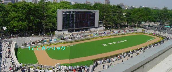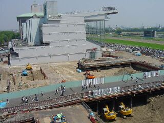 - 青葉賞レース結果 新スタンドの端からは左手側にパドック、正面に工事現場を挟んでメインスタンドそして右手側にコースが見える。 家内は背が低いのでゴール前にいてもどうせ見えないということなので、ターフビジョンも見えるここからレースを見ることに。
