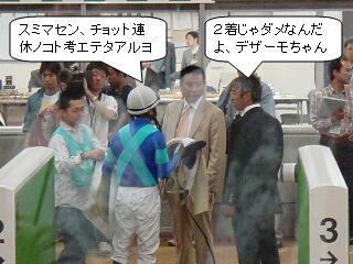 そしてメインの青葉賞は・・・順当にダンツキッチョーが勝ちましたが、2人とも外れです。 私は全敗でしたが、今日は取材に来たのですからいいんでス・・・ キッチョーってパチンコ屋(Tibasaは日本料理屋だそうです)を連想する、変な馬名ですね。 ま、ダービーではディープインパクトには敵わないかな~、という印象でした。