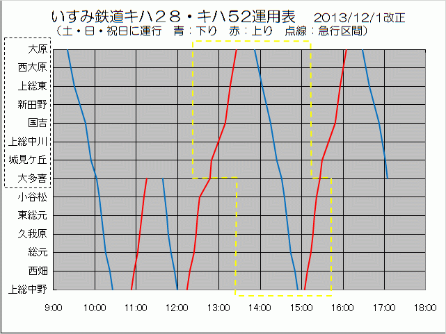 • キハ28・キハ52の運用表を作ってみました。黄色点線部分が今回の乗車列車・区間、大多喜からスタートして1往復する形です