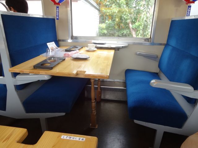 • キハ28の車内、なぜか途中ロングシートに。そしてレストラン列車用に4席のボックスを2席+テーブルに改造、大原からは進行方向が背中向きなのが少々残念