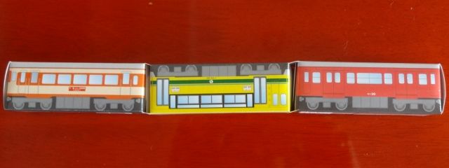 お土産にカレーや柿の種がありますが遊べそうなのはこのもなか、3個入りは500円。連結できないかと考えていたら1両だけ逆さにすると連結できました!(画像クリックで拡大&矢印キーで2枚スライド)
