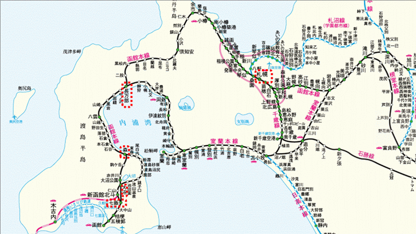 - 大沼~森間も上り(大沼方面行き)列車の登り坂を迂回するため、10km以上遠回りの砂原支線を作りました。その後列車の性能向上により特急列車はすべて本線経由となりましたが、普通列車は砂原支線沿線の需要がそれなりにあるため半々の割合で運行しているようです(yahoo路線調べ)