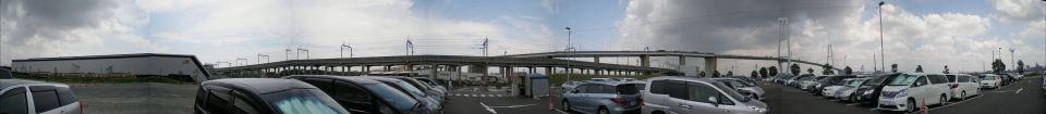 [1]↑周辺の模様、一番左のリニア・鉄道館。外には新快速117系が展示。そして高架のあおなみ線。それのさらに高架が伊勢湾岸道路、レインボウブリッジ・ベイブリッジ並の橋が架かっています。